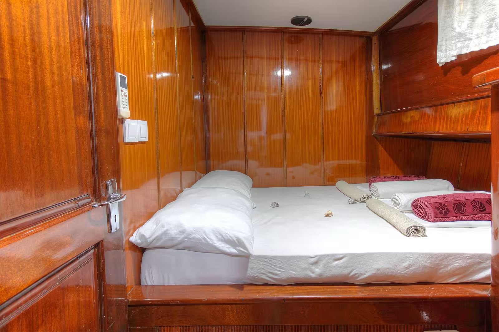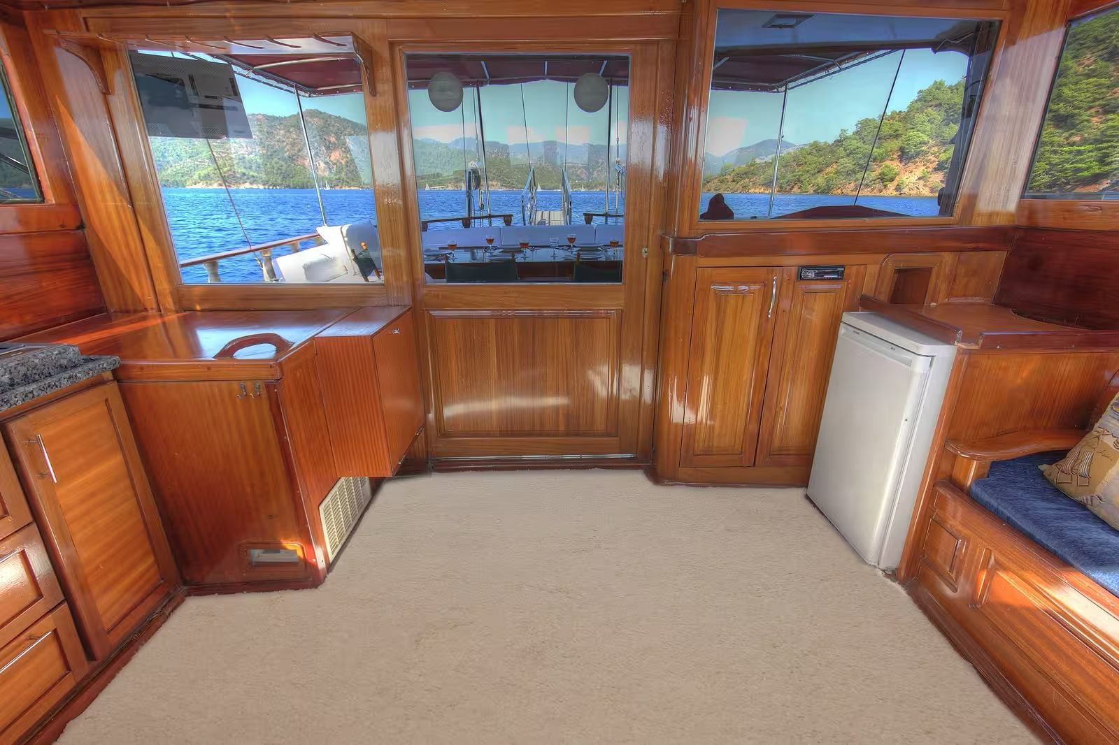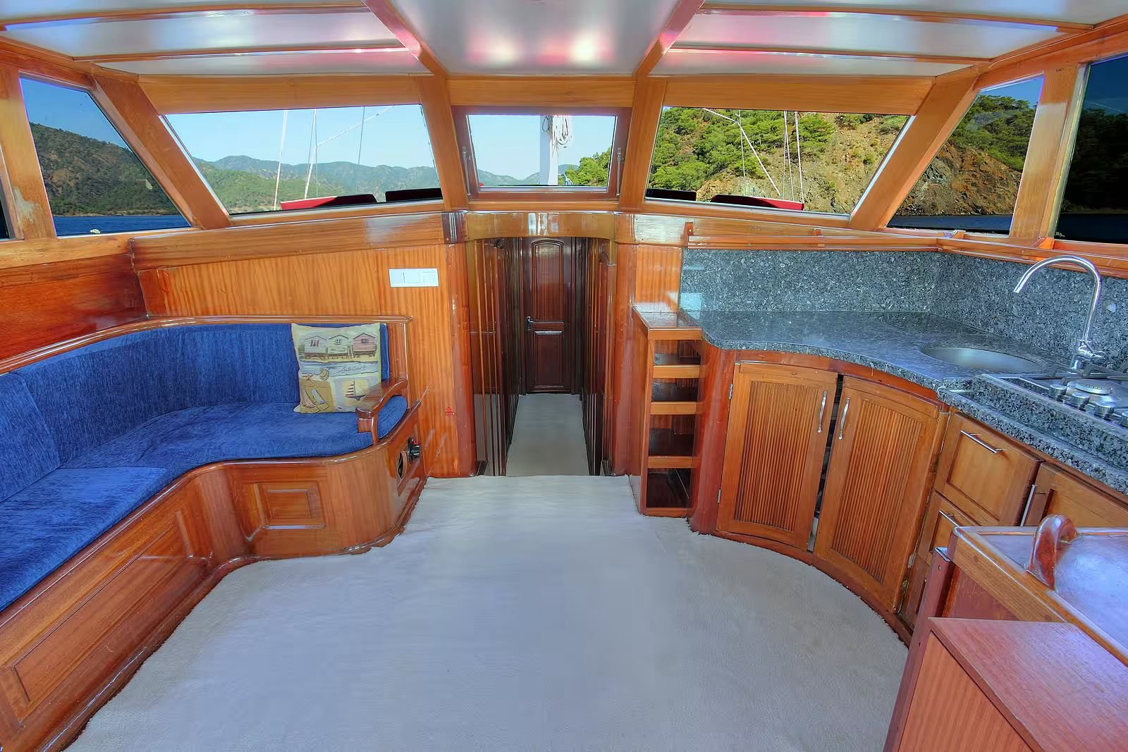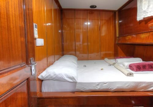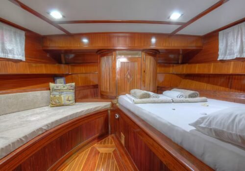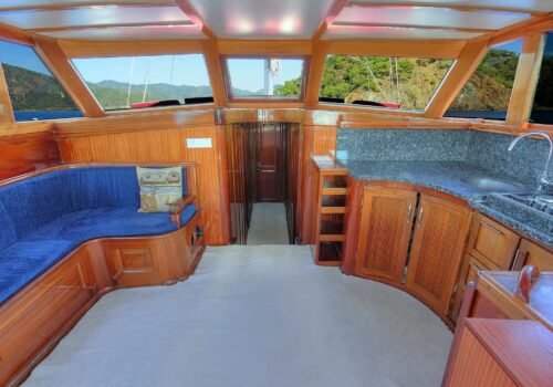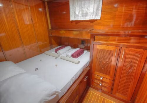 The aft deck of the boat has a large and comfortable seating area. There is a large table and seating group that can comfortably seat 6 people. Meals are usually served in this section and the most enjoyable conversations of the day take place here. The special felt wood details used in the overall design of the boat give the boat a very stylish and warm atmosphere. The cabins are also well-maintained, spacious and comfortable; they are carefully arranged for the guests to be comfortable throughout the holiday.