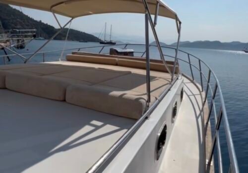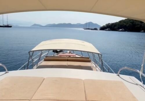 The exterior living areas are very pleasant. On the front deck there are large sunbathing cushions and an awning over them, providing comfortable use at any time of the day. There is also a seating area in front. The 3 sunbathing areas on the flybridge are ideal for guests who want to enjoy the sun all day long.