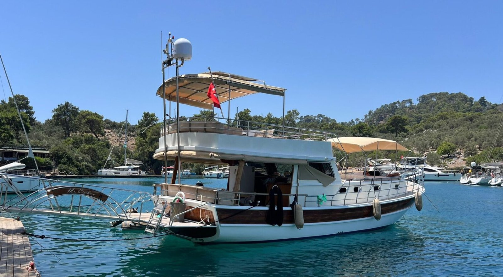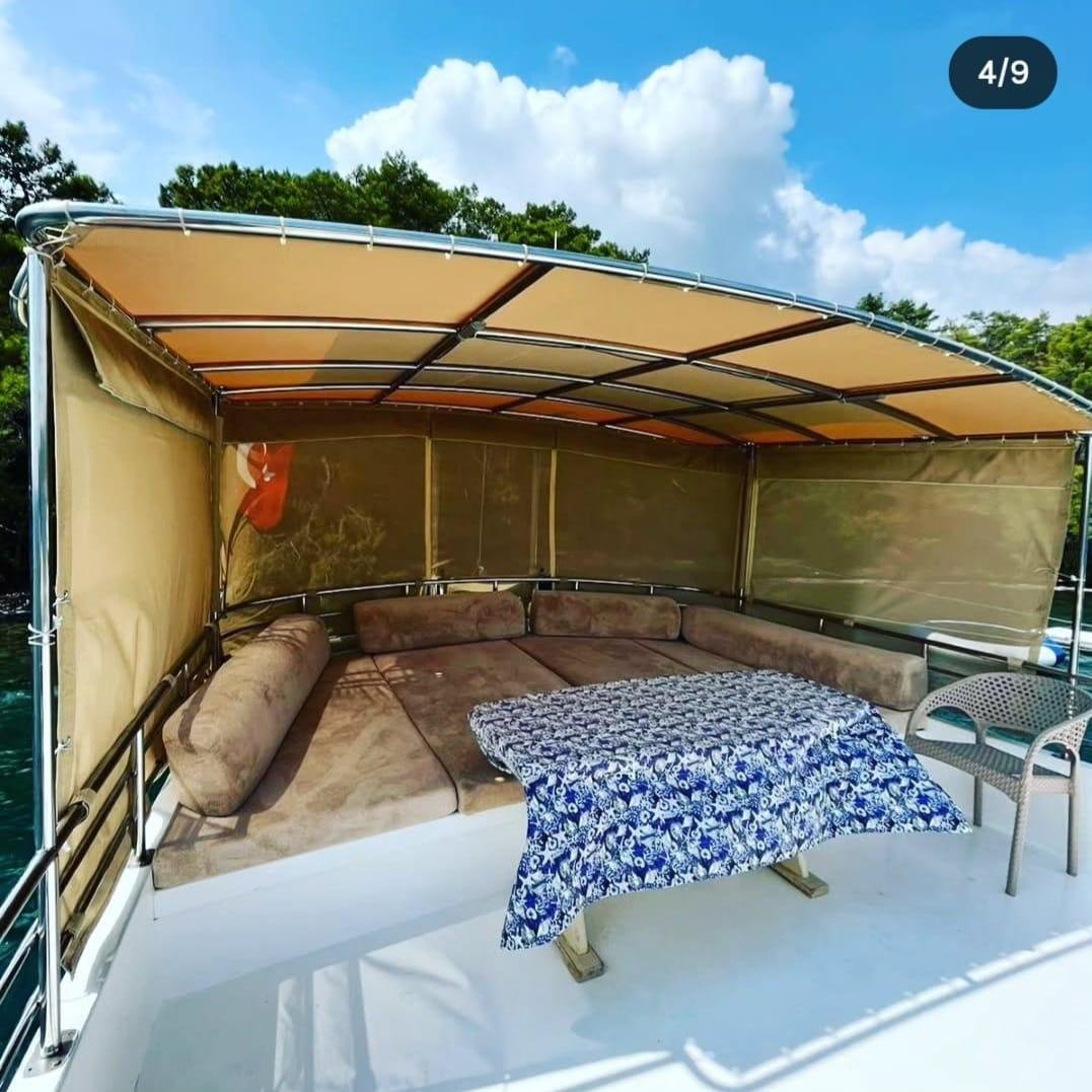 The flybridge area, which is rare in boats of this size, adds a special comfort to our boat. The seating areas on the flybridge are protected by an awning. There is also a service boat and paddleboard on our boat, making the sea more enjoyable.