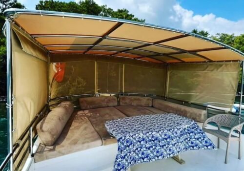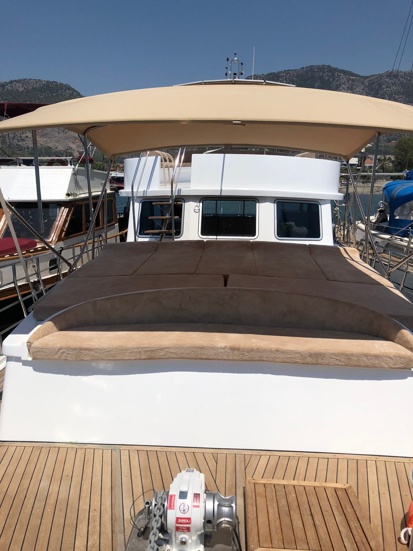 There is a large sunbathing area on the front deck of our boat and offers a comfortable sunbathing opportunity with approximately 6 sunbeds. There are also awnings in this area and it provides comfortable use at any time of the day. There is also a seating area in the front part. In the aft section, there is a large dining and relaxation area where 6 people can sit comfortably.