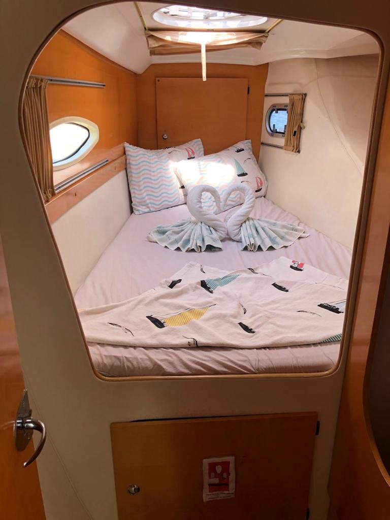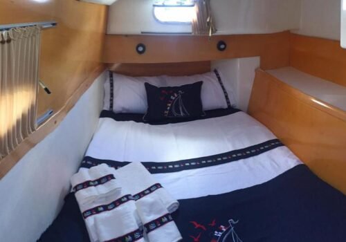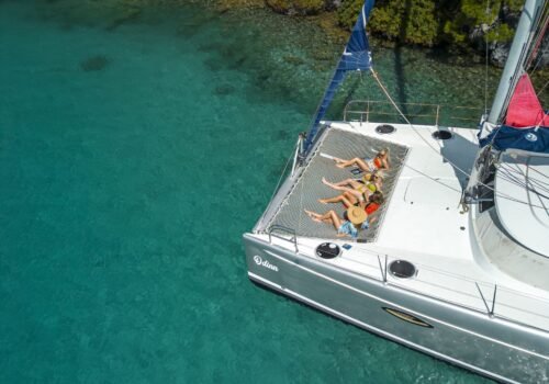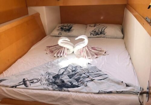 Our catamaran 40304 was built in 2008 and refitted in 2022. The boat is 11.4 meters long and 6.5 meters wide. The netted area on the front deck is one of the most popular features of catamarans and offers a relaxation area on the sea. This area is especially ideal for guests who want to sunbathe, enjoy the view and have a pleasant time on the sea.