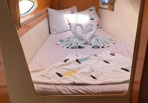 There are 4 double cabins on our boat. There are also 2 common use bathrooms on the boat. Although the technical capacity of our catamaran is higher, considering the comfort of our guests, up to 5 – 6 guests are served. In this way, a wider and more comfortable usage area is created on the boat. A crew of 2 people accompanies our guests throughout the holiday.