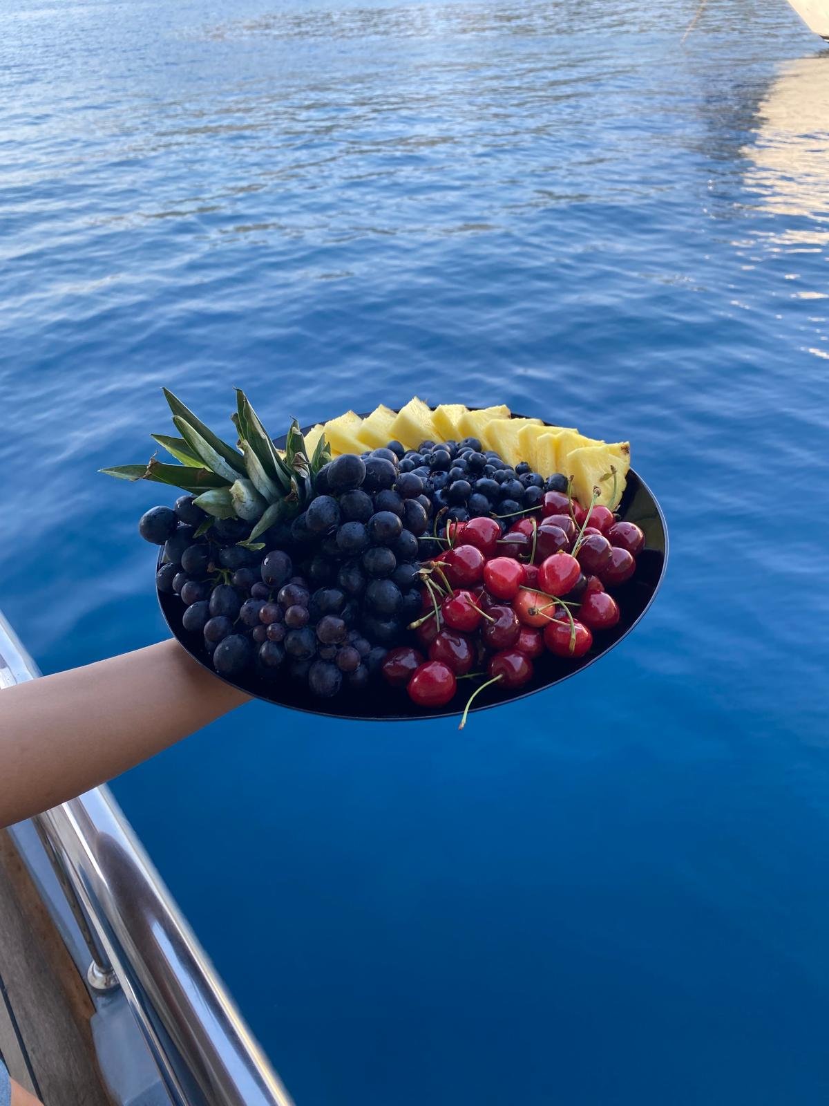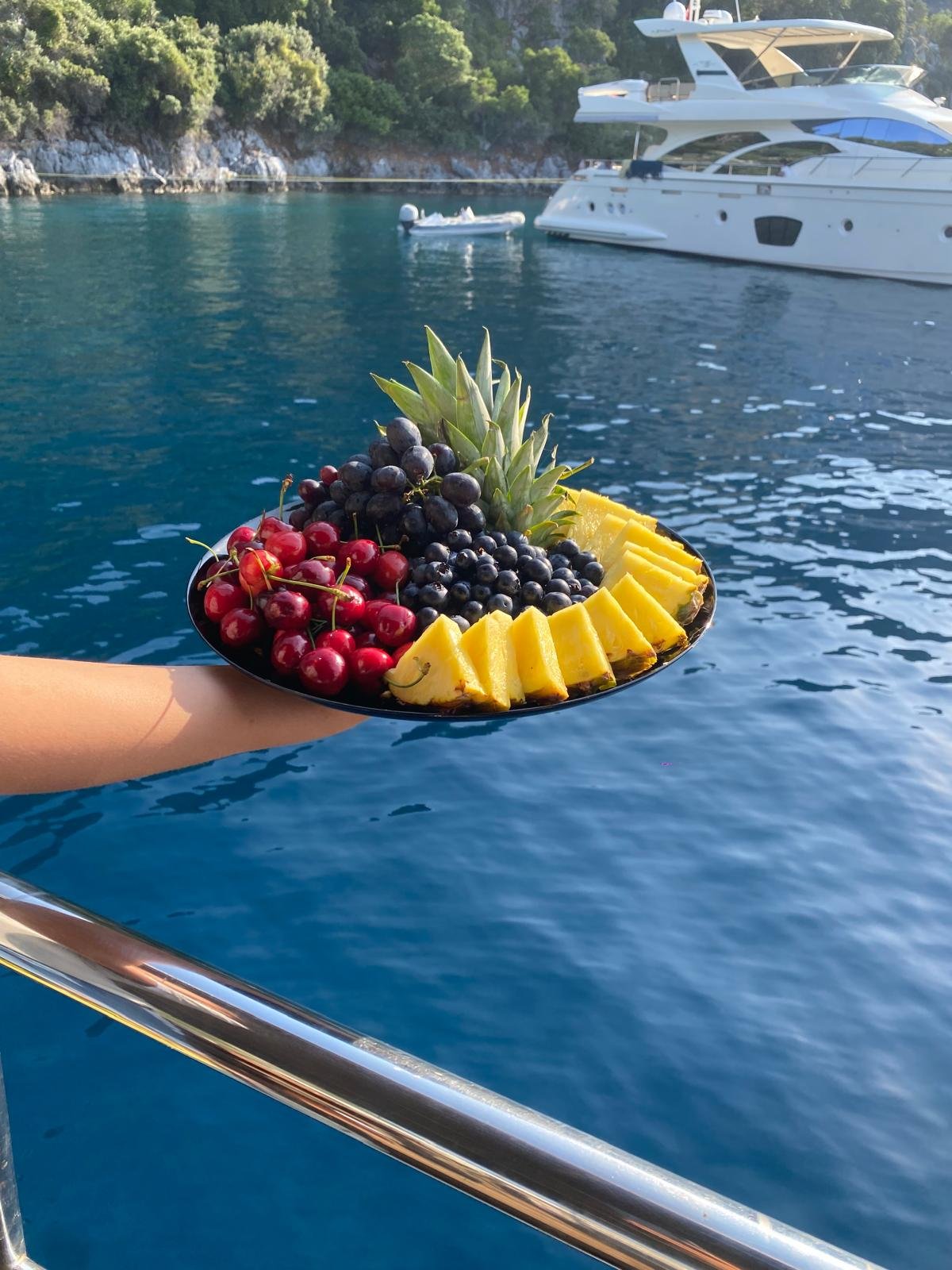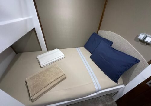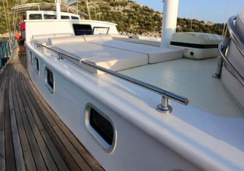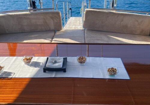 Our boat is a pleasure spot when it comes to social areas. On the aft deck there is a large table and comfortable seating for 8 people to dine comfortably, while inside there is an L-shaped indoor lounge where you can enjoy even in adverse weather conditions. For those who want to enjoy the sun, there is a sunpad on the foredeck for everyone and a separate seating area where you can sip your coffee against the sea. While enjoying the blue waters, our 3 experienced crew members are ready to provide you with the best service during your vacation.