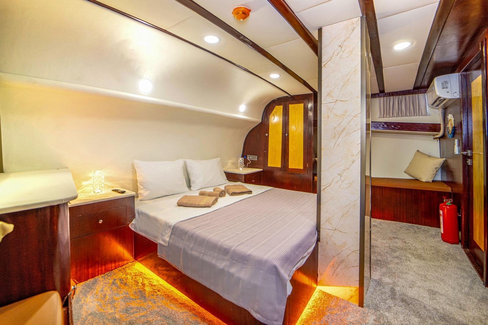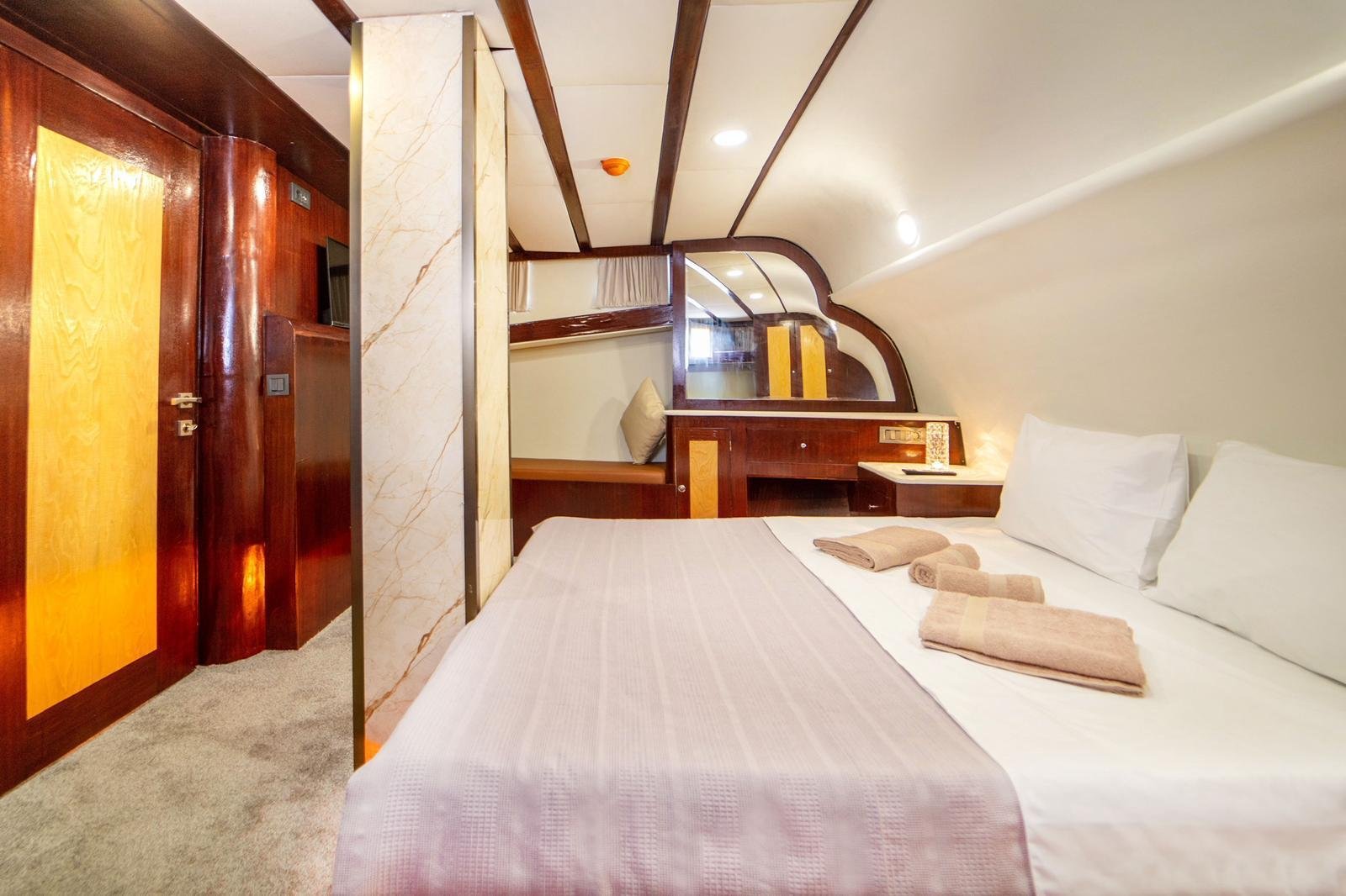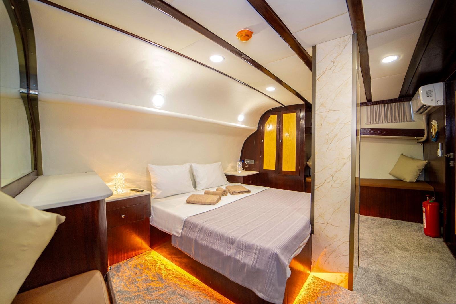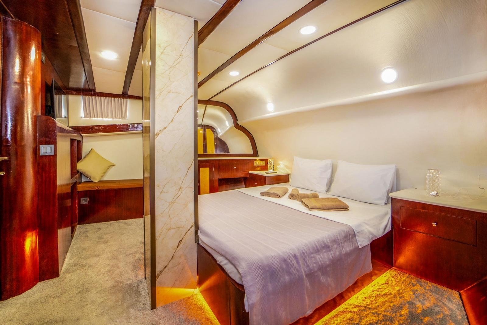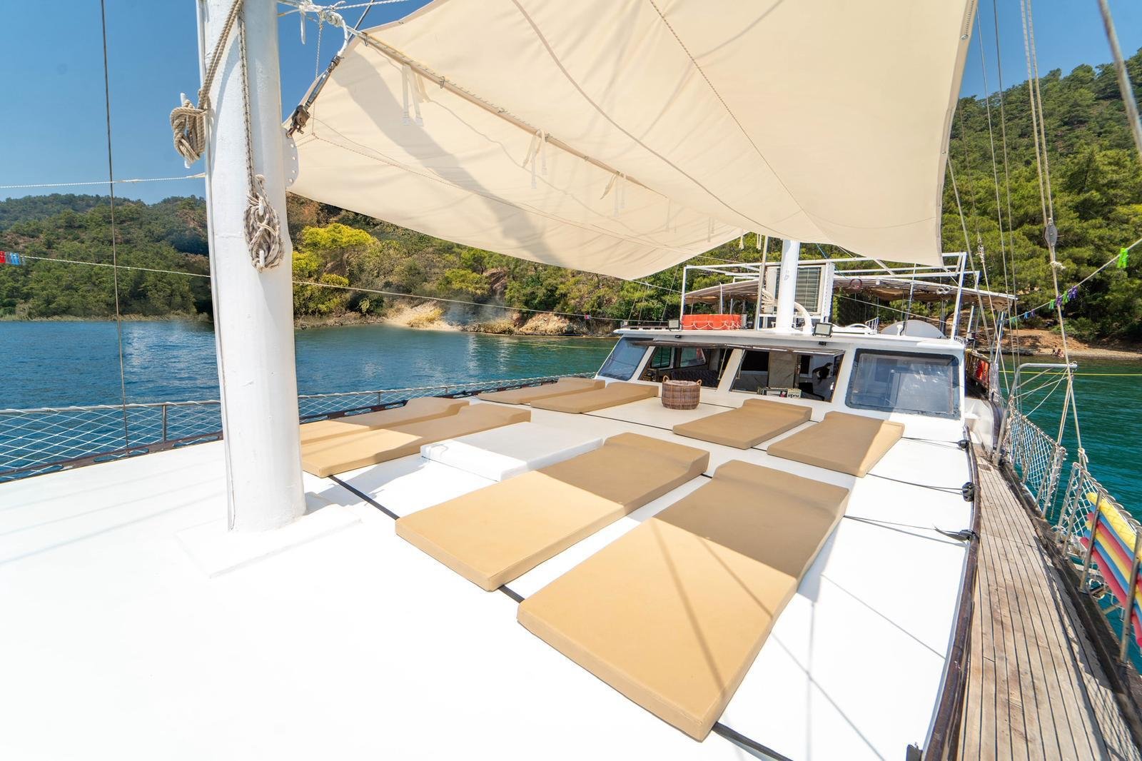 40112, built in 1997, was completely refitted and modernized in 2026. The most remarkable feature of our boat is that although it had 8 cabins in its first refit in 2025, it currently serves as 4 cabins. In this way, the cabins offer a more spacious and comfortable usage area. There are 8 sunbathing cushions in the front and the toilets are designed in a large and spacious way. In the aft seating area, there is a U-shaped seating group and 8 chairs.