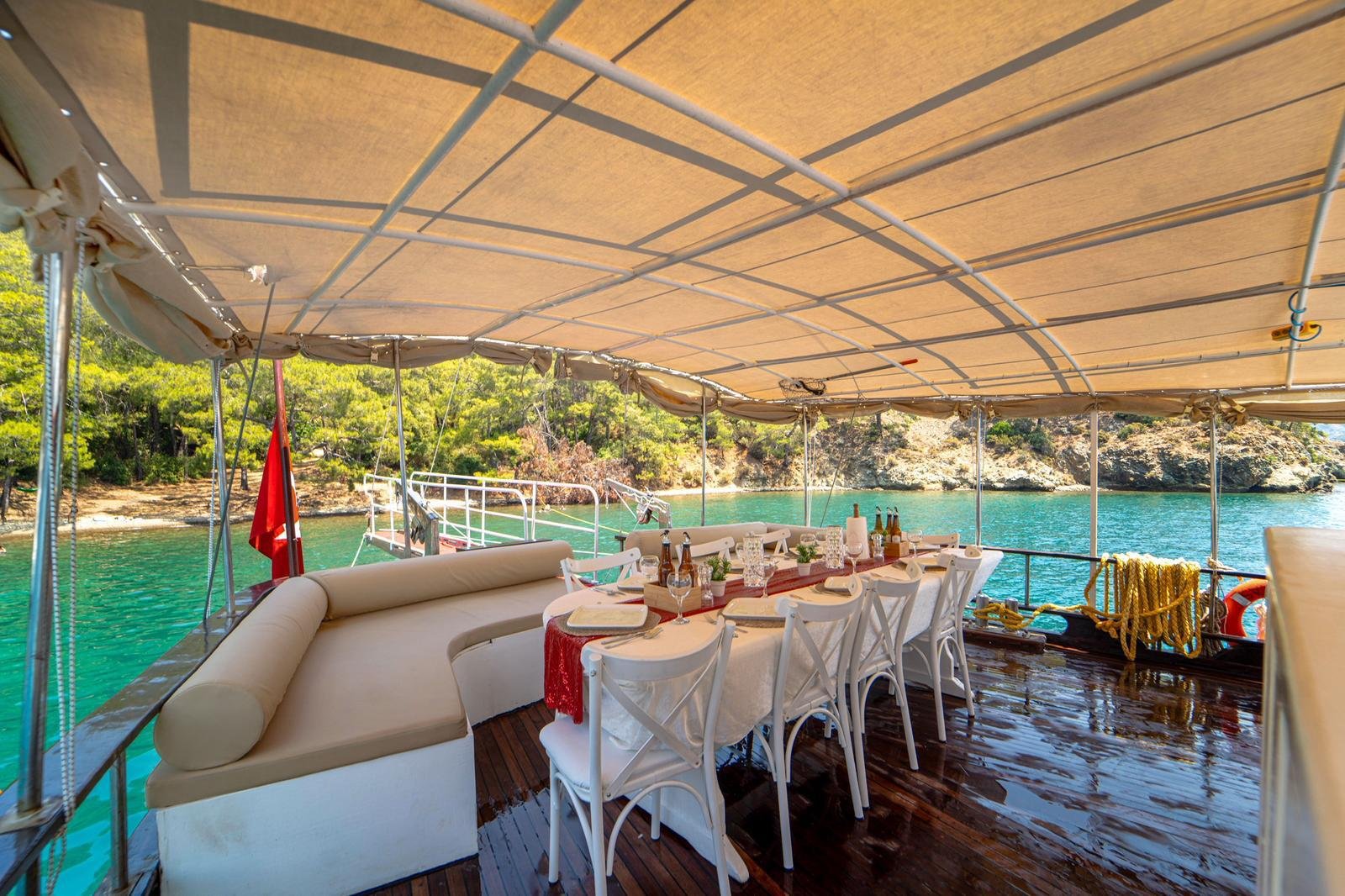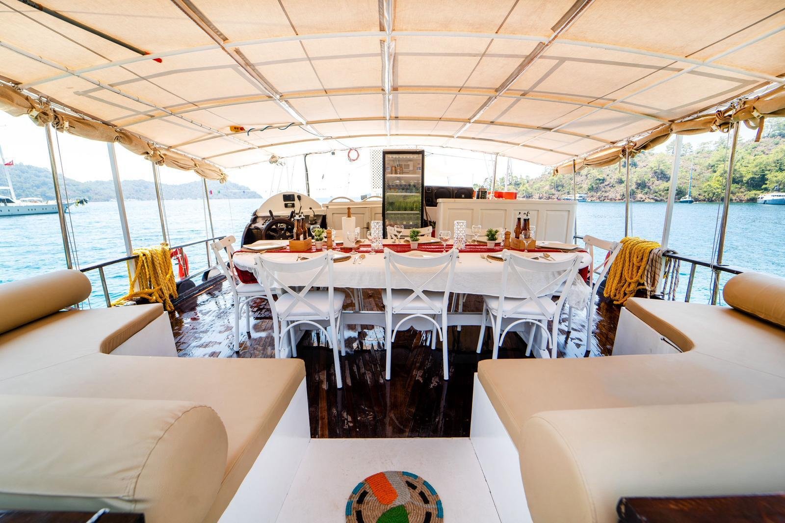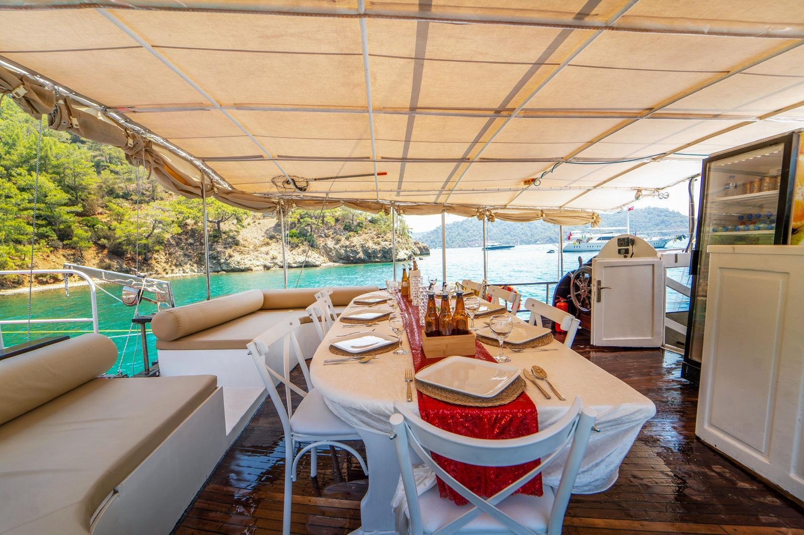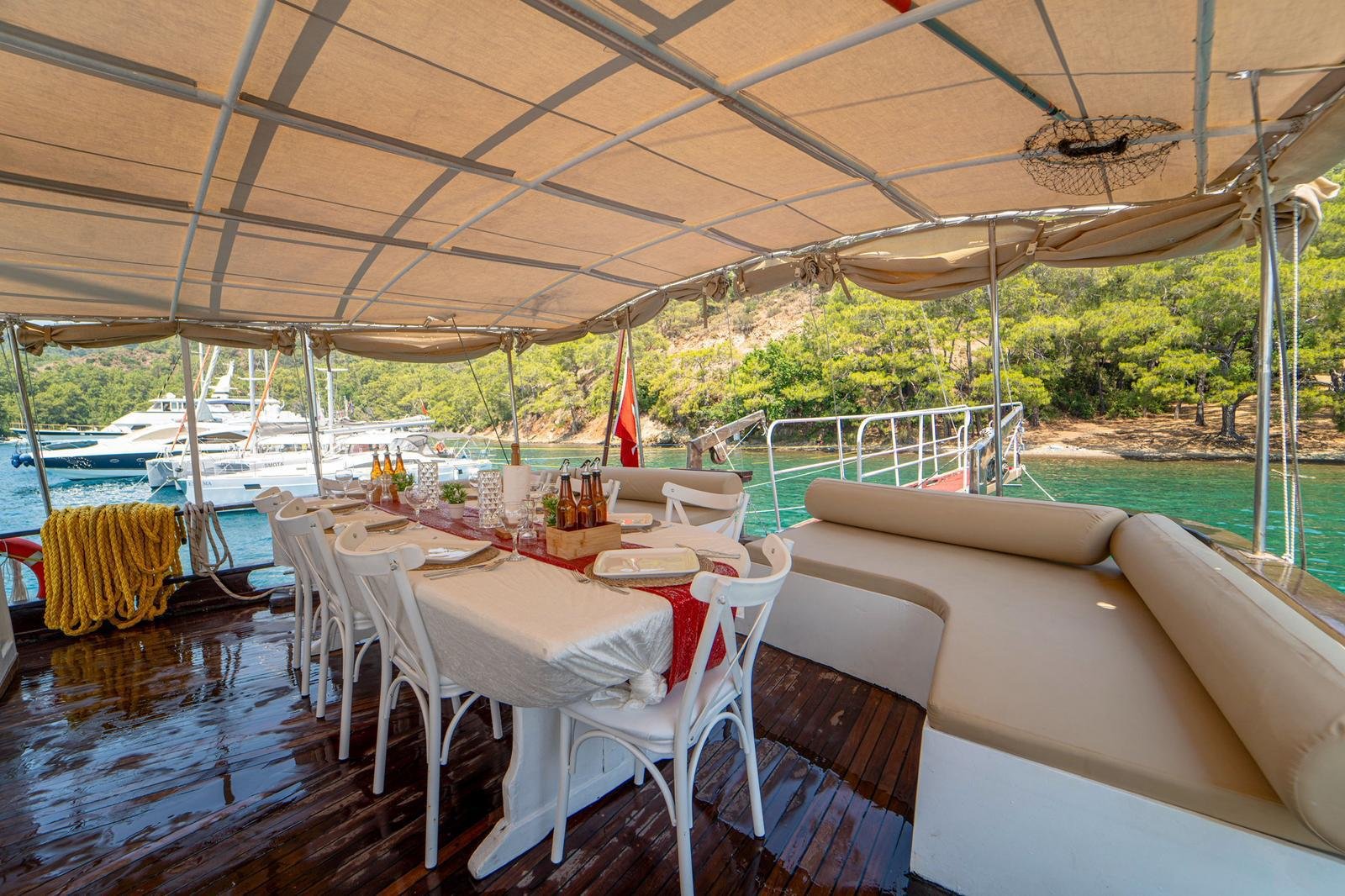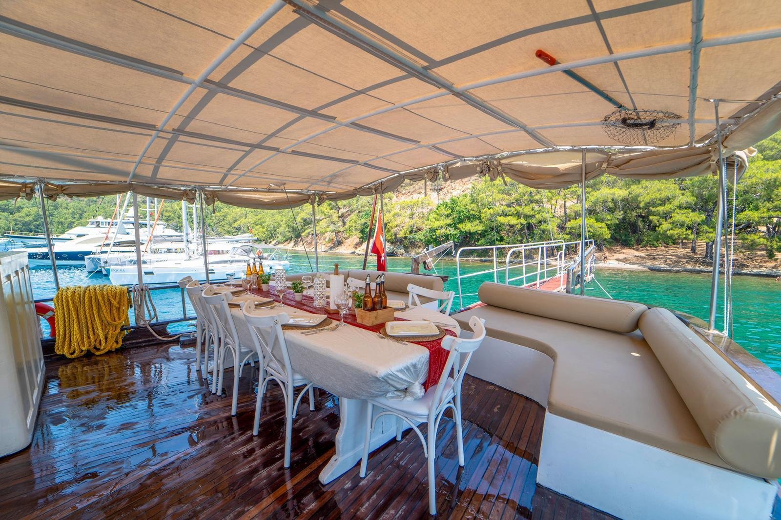 Our boat has both a large open deck and a covered seating area. The covered area offers a comfortable environment, especially for guests who want to be protected from the sun or wind. The open area is ideal for enjoying the view and the sea. There is also 1 paddleboard on board and it can be used for sea activities in the bays of Gocek.