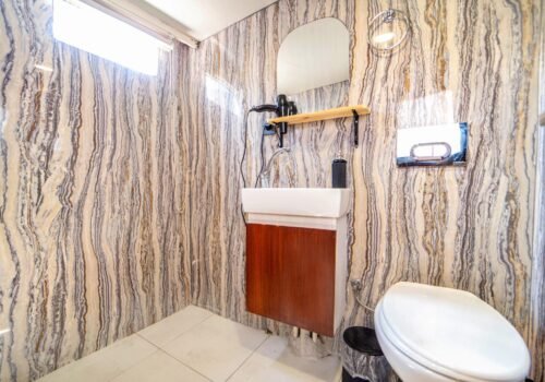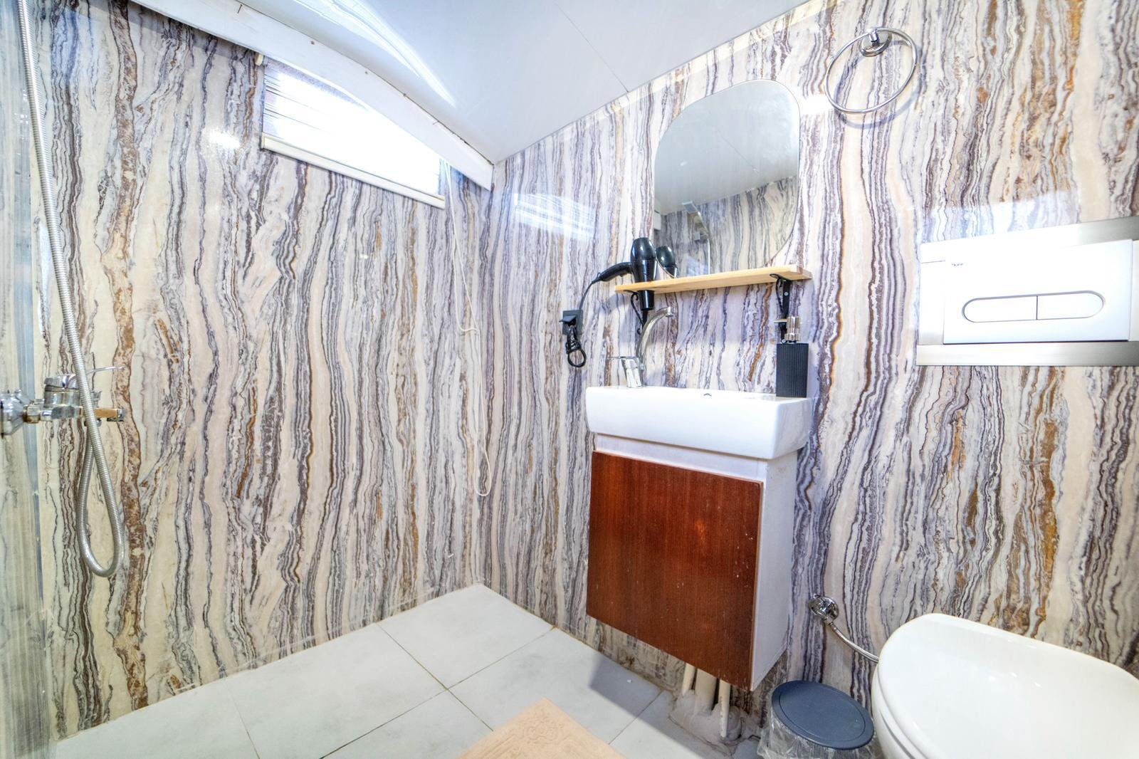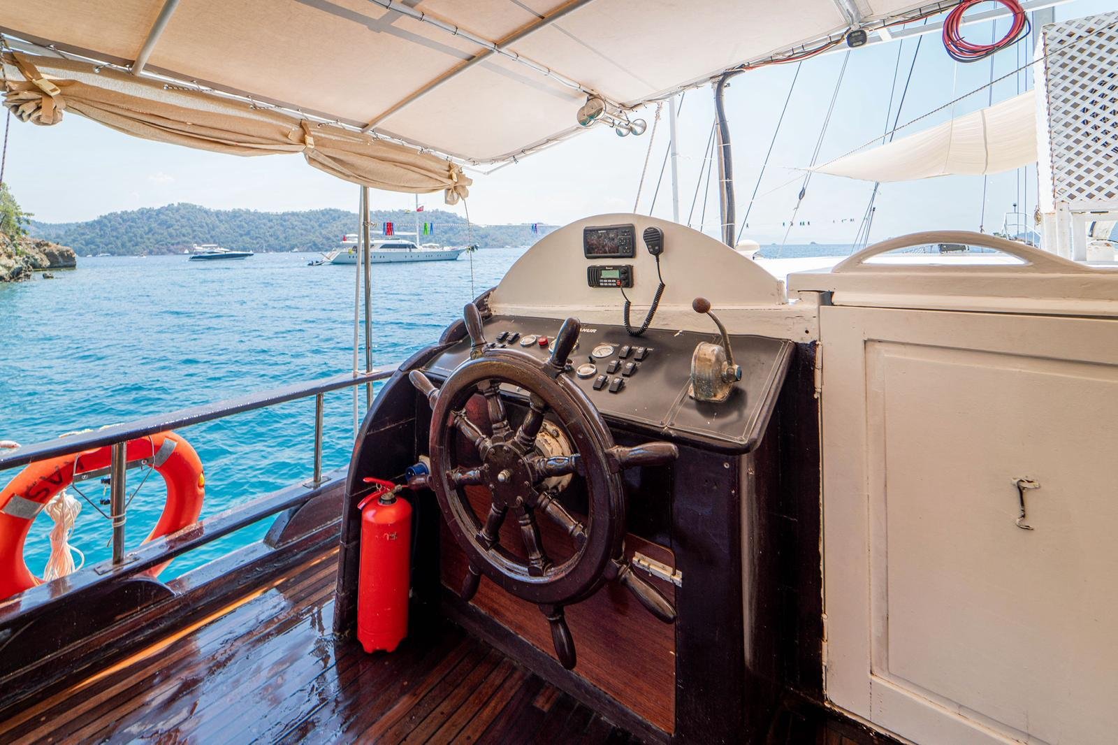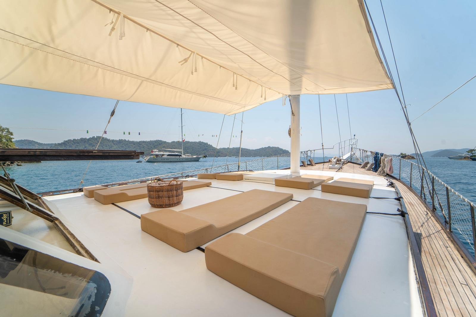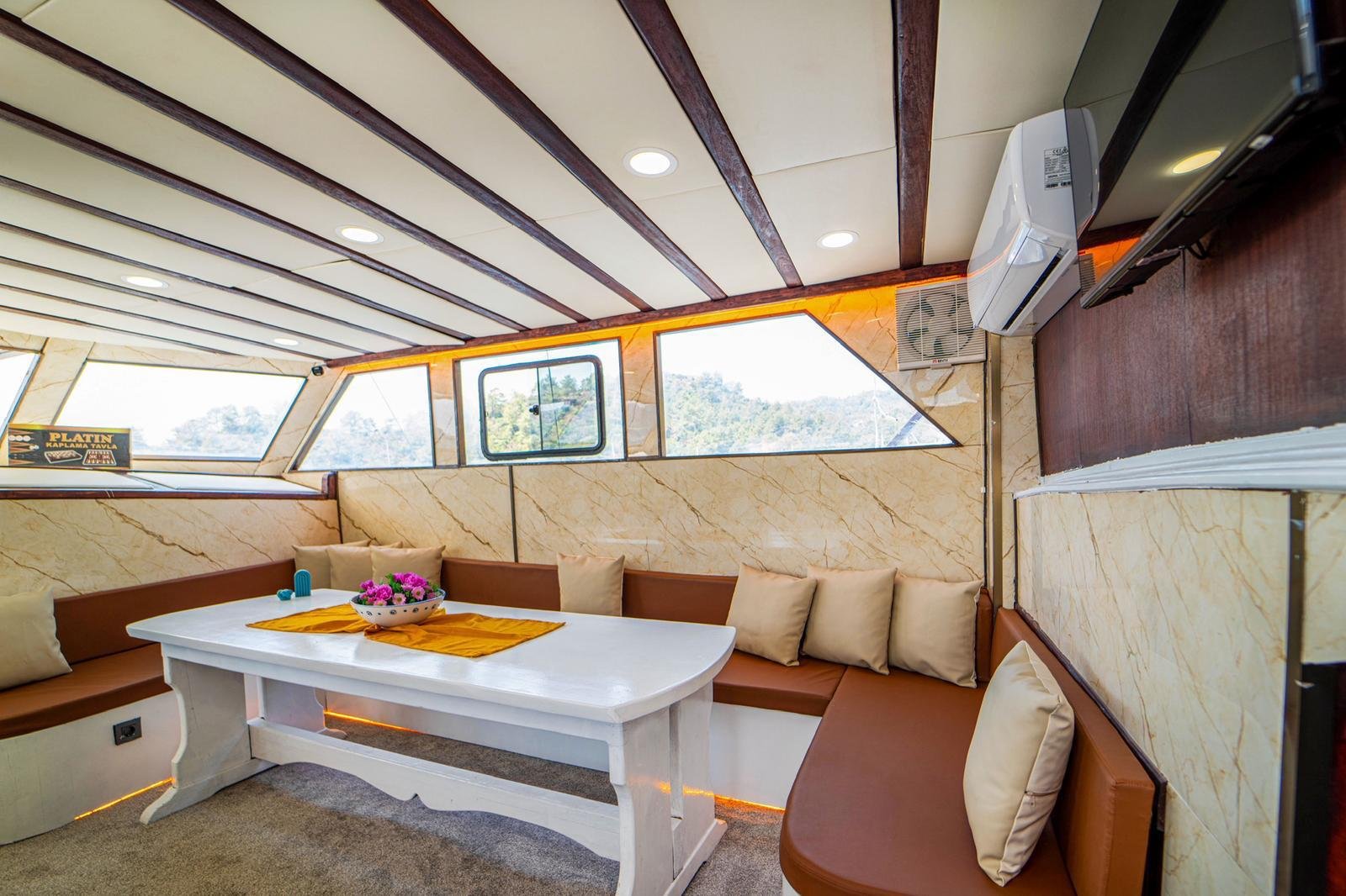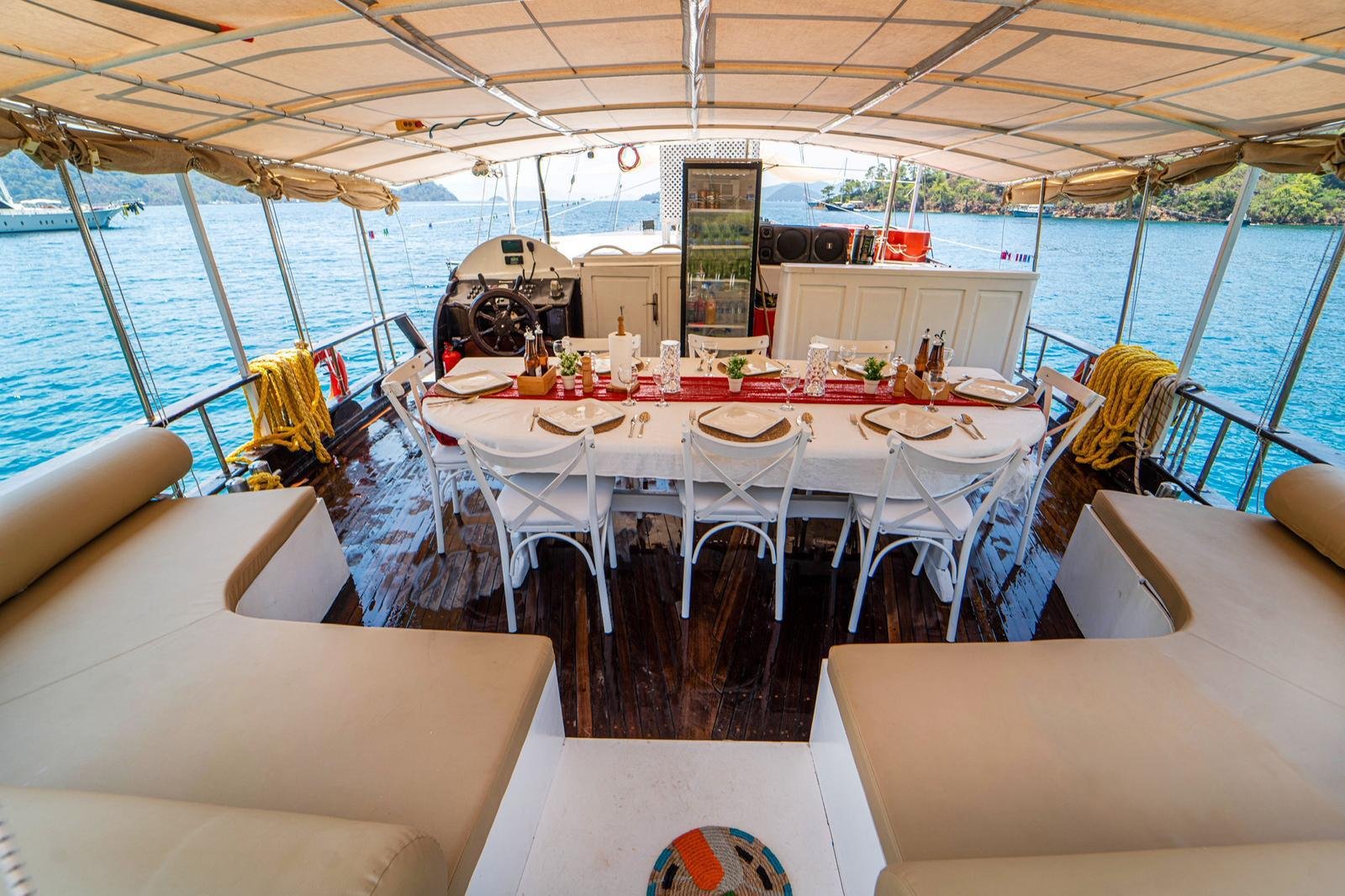 Our boat has both a large open deck and a covered seating area. The covered area offers a comfortable environment, especially for guests who want to be protected from the sun or wind. The open area is ideal for enjoying the view and the sea. There is also 1 paddleboard on board and it can be used for sea activities in the bays of Gocek.