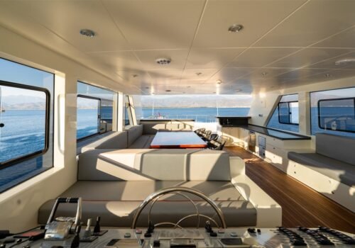 The indoor saloon area of our boat has a very spacious and comfortable living area. As the saloon is largely surrounded by large glass panels, you will never lose sight of the sea view even when you are inside. With its bright, spacious and modern design, the saloon area offers a very comfortable environment for relaxing, chatting or having a pleasant time during the day.