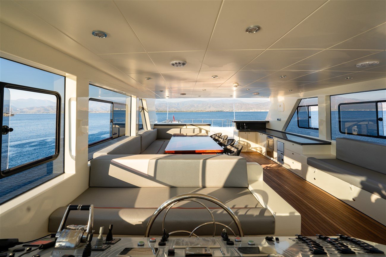 One of the most remarkable areas of this special trawler is the large flybridge. The flybridge has both indoor and outdoor seating areas and offers a very spacious living area. There are also sunbathing areas here, offering a luxurious upper deck experience where you can enjoy the sea and the view throughout the day. Thanks to the large seating area, all guests can easily spend time here.