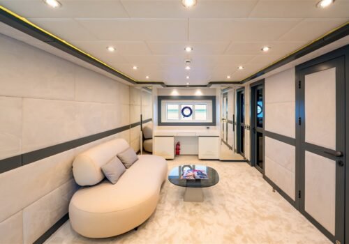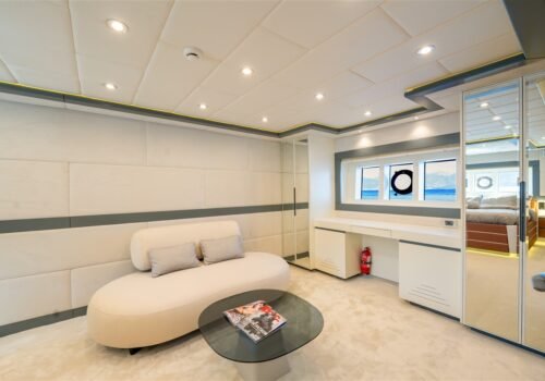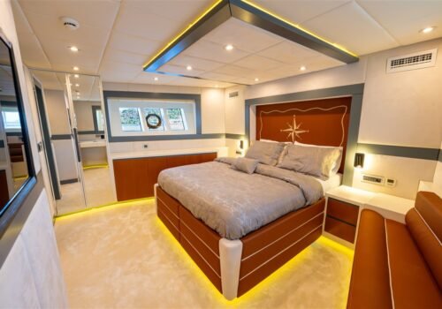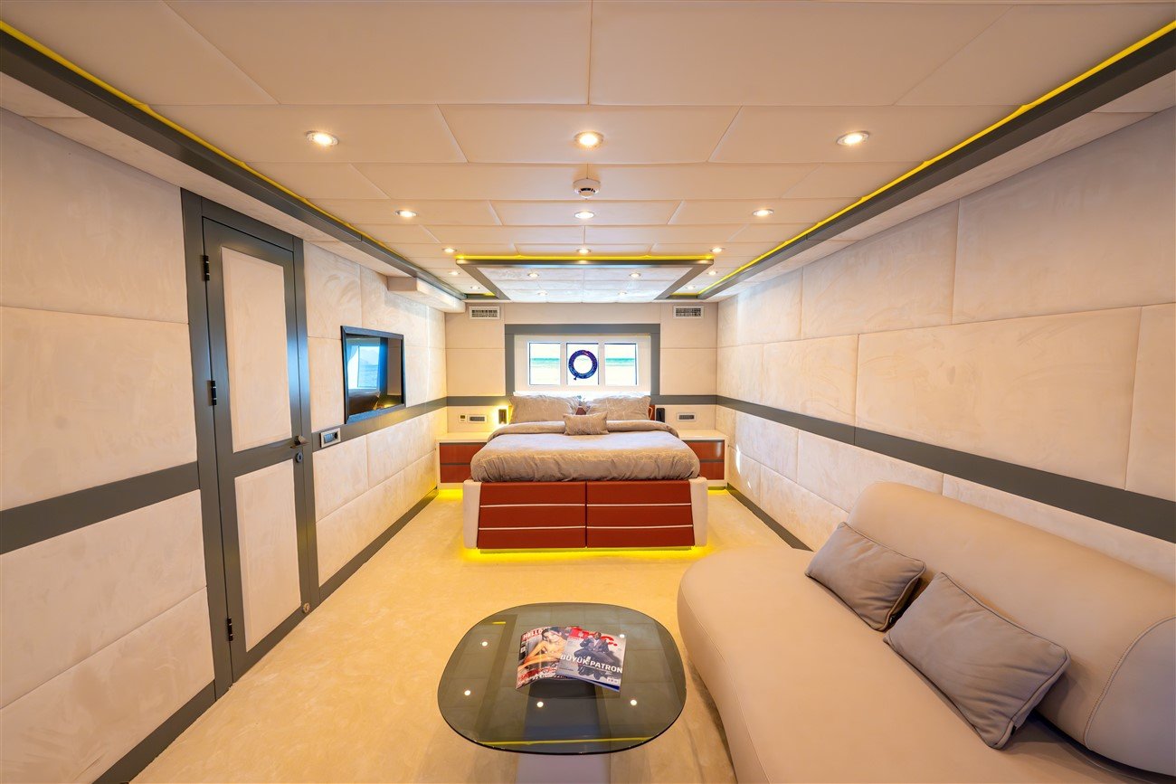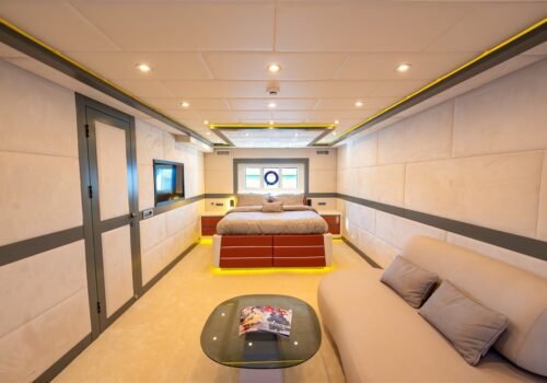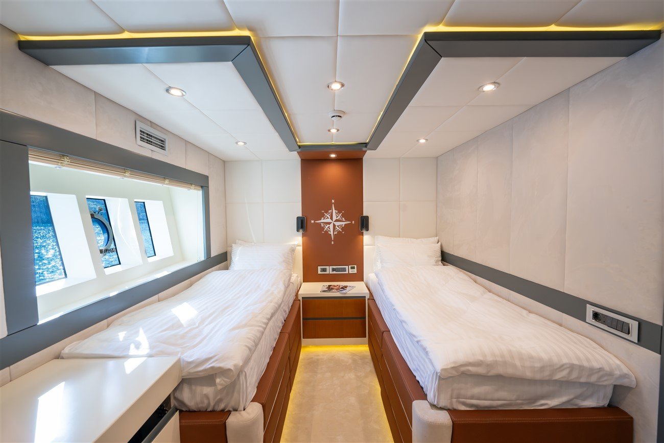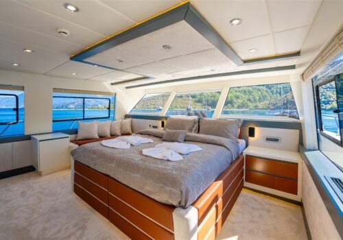 The VIP master cabin, one of the most private areas of our boat, is located on the foredeck. Surrounded by large U-shaped windows, this cabin has a unique atmosphere that opens almost completely to the sea. This cabin is one of the most privileged areas on the boat, offering an accommodation experience in touch with the sea. The other master cabins are also very spacious and comfortable, and all details have been considered for the guests to have a comfortable accommodation experience. All cabins have private shower and WC.