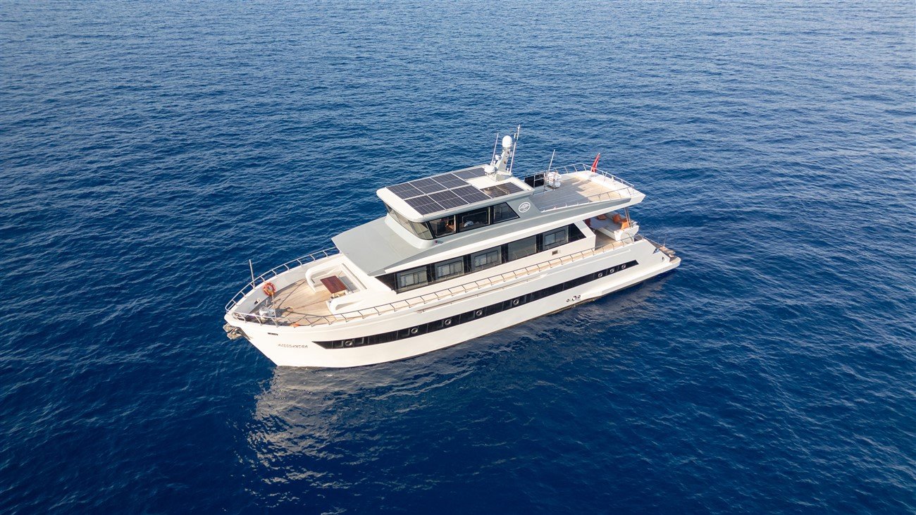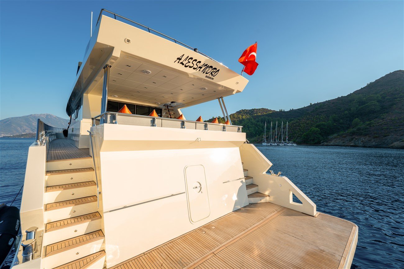 Built in 2025, this special trawler with a length of 26 meters (85 ft) and a width of 7 meters is a new generation motor yacht that combines luxury and comfort at sea. With its modern design, spacious living areas and elegant details, it offers a very pleasant blue cruise experience. This sparkling boat, which we provide service through Göcek Yacht Charter, is based in Göcek, but can also serve our guests in Bodrum, Selimiye and different routes upon request. Our boat has 4 cabins with a total capacity of 8 guests, 1 VIP master, 2 master and 1 twin cabin. All cabins have private shower and WC and the boat has air conditioning system and air conditioning is provided for 6-8 hours a day. For the comfort of our guests, there is a professional crew of 4 people on the boat.