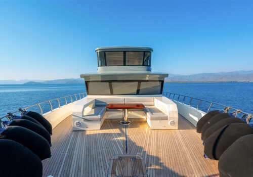 There is a large U-shaped seating area and table on the front deck of our boat. It offers a very pleasant area to enjoy the sun during the day, have a coffee with a view or watch the sunset. Being one of the closest points to the sea, the front deck provides a very special atmosphere for the guests.