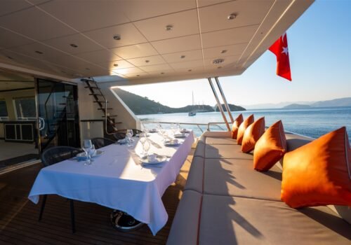 Our boat has a very spacious and comfortable seating area on the aft deck. This area, where eight people can easily sit together, offers an ideal environment especially for meals, pleasant conversations and enjoying the peace of the sea in the evening hours. Thanks to the large table and spacious seating arrangement, our guests can spend a very comfortable time here. This area is one of the most used parts of a luxurious and comfortable cruise experience.