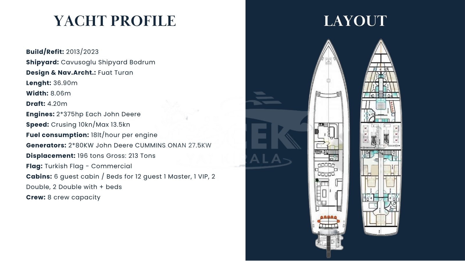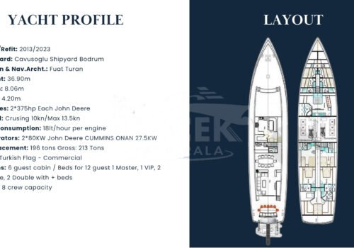 60401 kodlu teknemiz, Göcek Yat Kirala aracılığıyla misafirlerine sunulan üst segment bir lüks sailing yat olup, 36.9 metre (121 ft) uzunluğu ve 8 metre en genişliği ile denizde konfor ve estetiği bir arada sunar. Teknemiz 14 misafir kapasiteli, 6 kabinli olup kabin dağılımı: 1 VIP master, 1 master, 2 double ve 2 triple (her triple kabin bir double ve bir single yatak) şeklindedir. Tüm kabinlerde lüks duş ve WC bulunmakta ve klima mevcuttur.