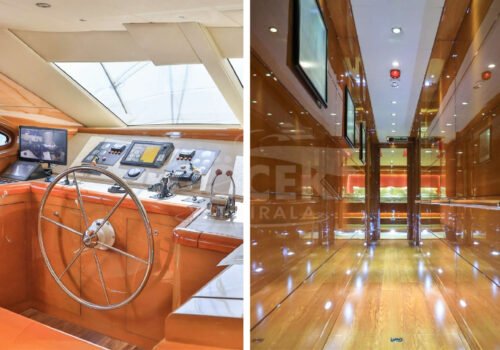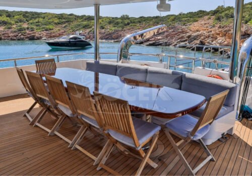 Teknenin flybridge’i güneşlenme alanı, bar ve oturma alanları ile üst segment bir deneyim sunar. Güvertede güneşlenme minderleri, geniş oturma alanları ve yan merdiven ile denize iniş çıkış imkanı mevcuttur. Kıç oturma alanı da ferah ve konforludur.